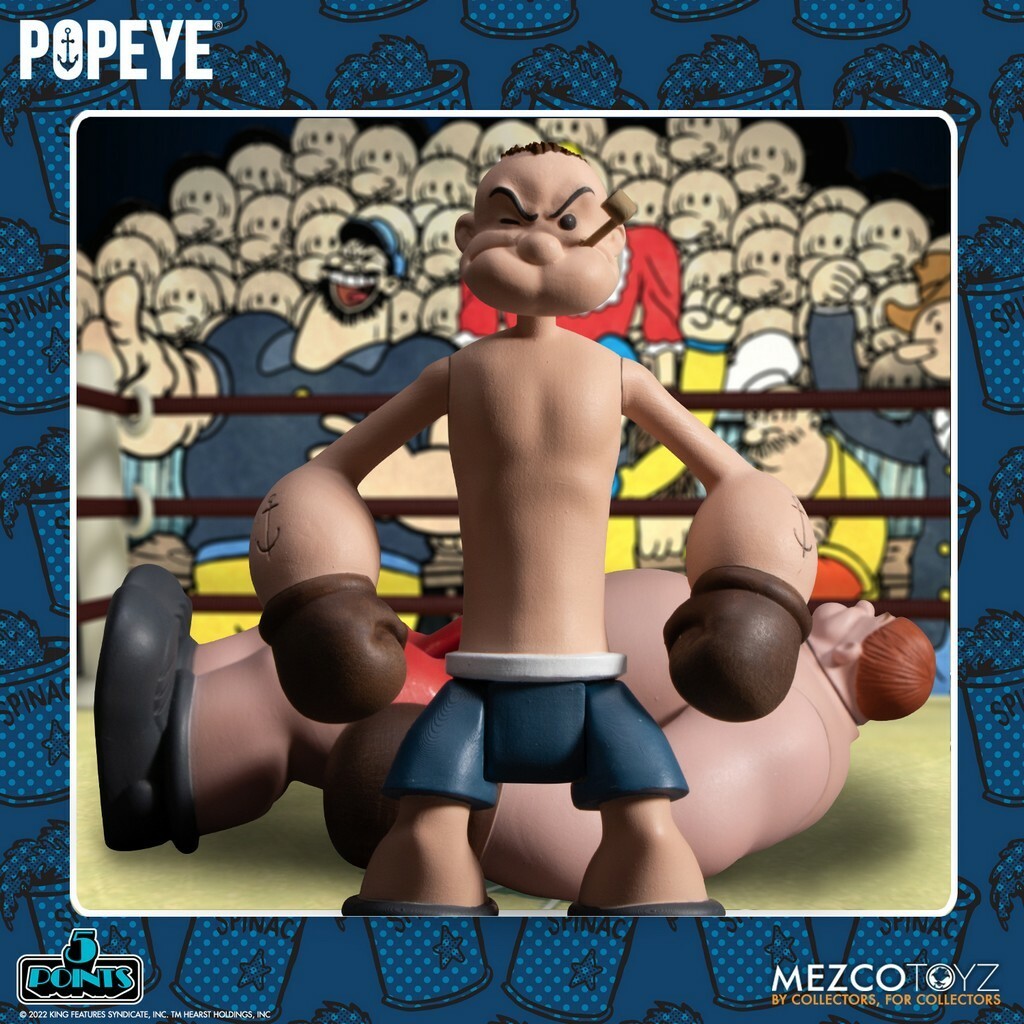 Mezco Toyz, dentro de su serie 5 points presenta este set que incluye a Popeye, a Oxheart y un ring de boxeo como display.