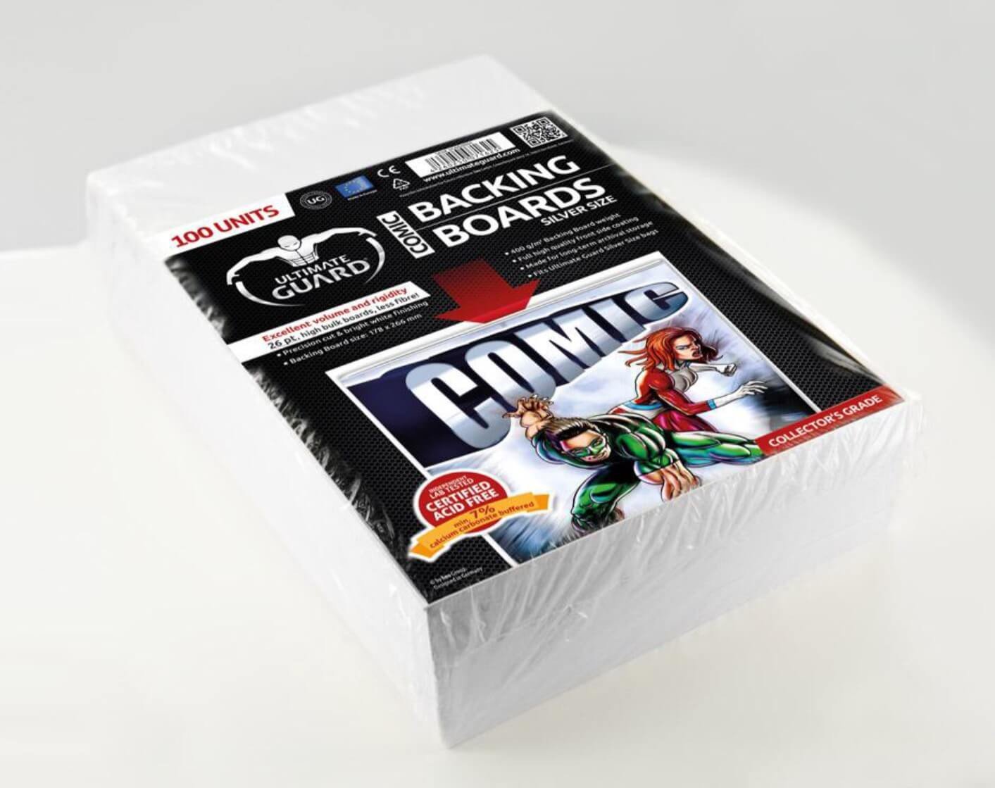 Protege y guarda tus cómics tamaño Silver con los cartones rígidos (backing boards) producidos por Ultimate Guard. Cada paquete contiene 100 unidades. Estos cartones evitan el deterioro de tus cómics ya que los mantienen rígidos y rectos dentro de la bolsa, convirtiéndose en una ayuda esencial para preservar tus cómics a largo plazo. Cartones para cómics libres de ácido.