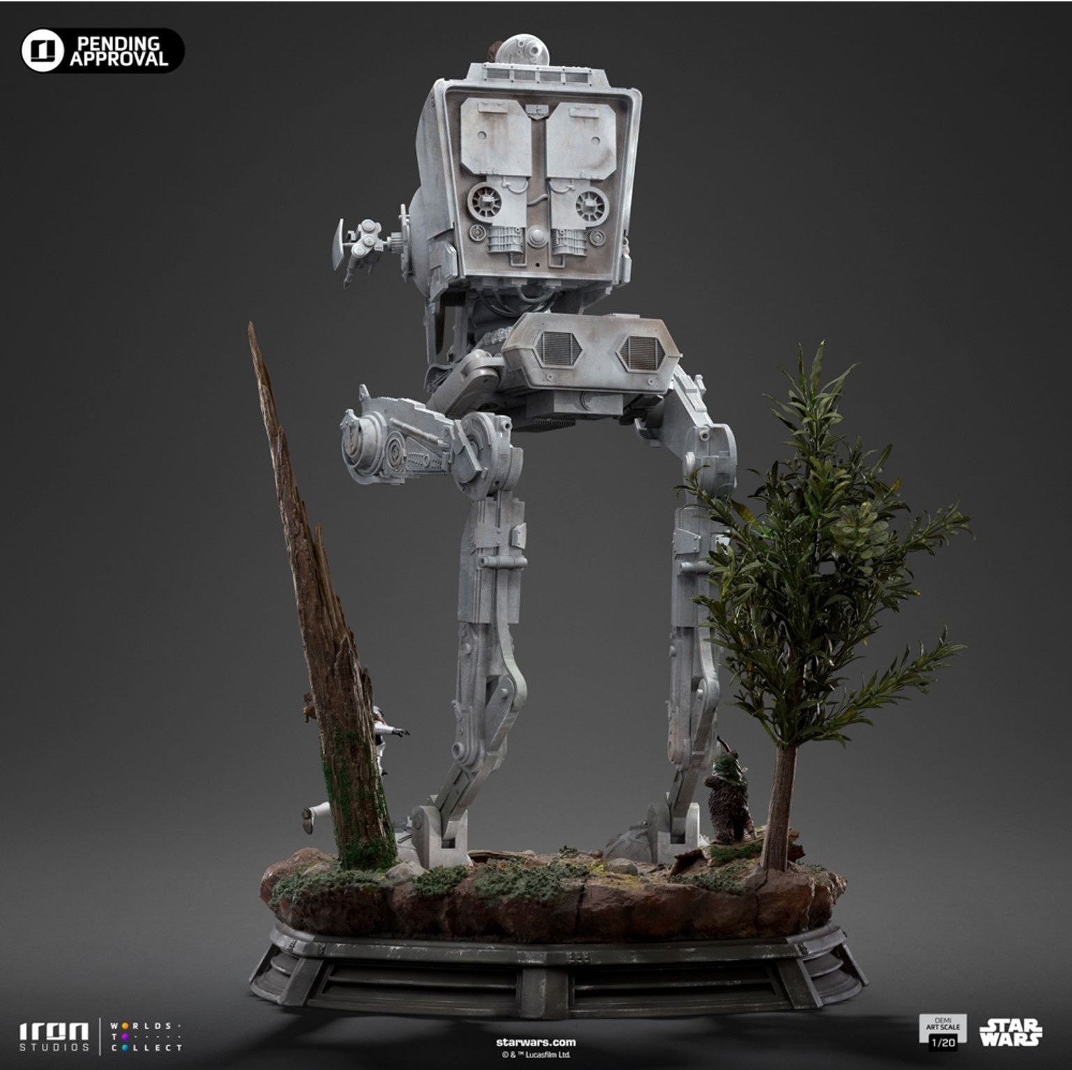 La estatua muestra a Chewbacca emergiendo de la escotilla del AT-ST, rodeado de detalles vívidos en una base diorama del bosque. Edición limitada.