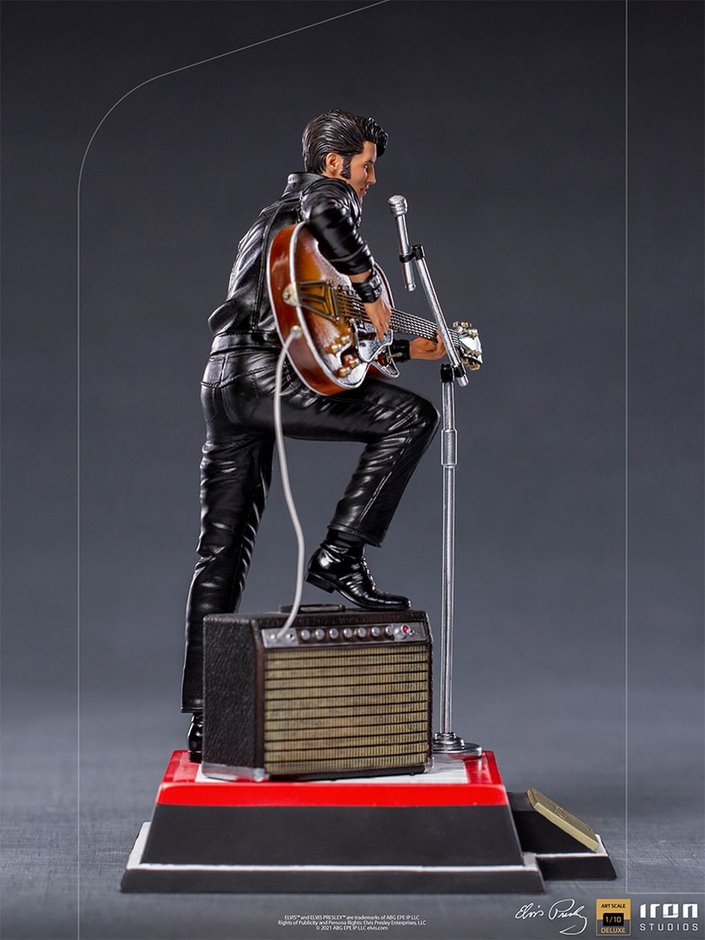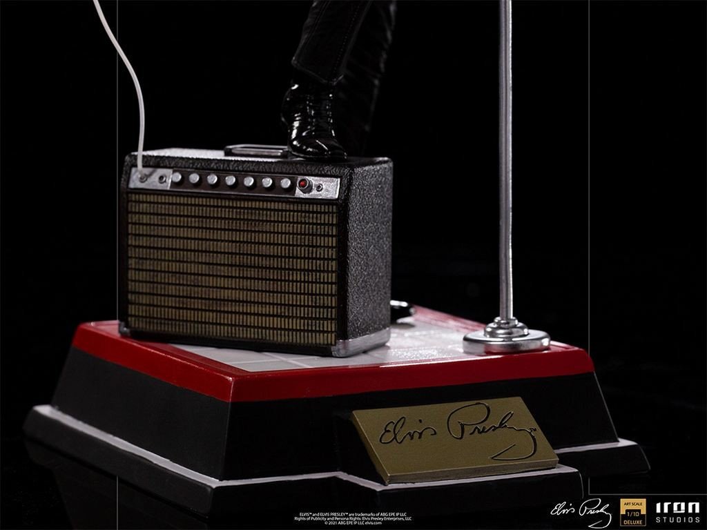Esta estatua recrea aquel mítico momento con todo lujo de detalles, entre los que no faltan el amplificador Benson 200 y la guitarra Gibson Super 200 CES 1963 de Elvis así como parte del escenario sobre le que actuó.