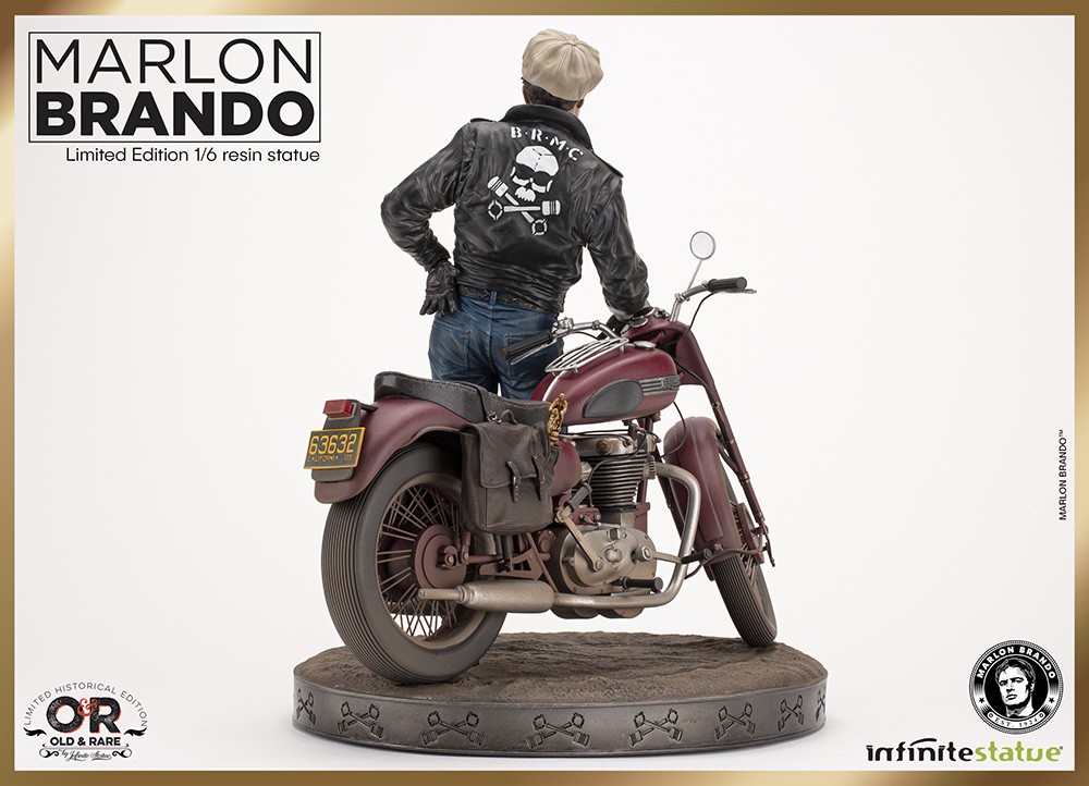Infinite Statue agrega esta extraordinaria estatua de Marlon Brando con Triumph Thunderbird a su línea de estatuas Old & Rare. Una obra maestra de detalles, colores, perfección, la escultura es de resina pintada a mano y descansa sobre una base circular esculpida. Viene en edición limitada.