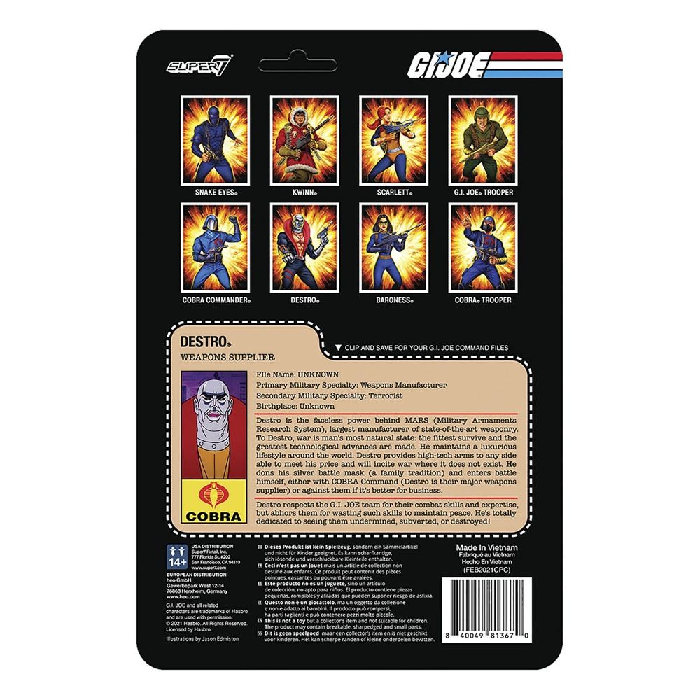 Figura articulada de Destro basada en la franquicia G.I. Joe  para la serie ReAction de Super7, con un tamaño aproximado de 10 cm.