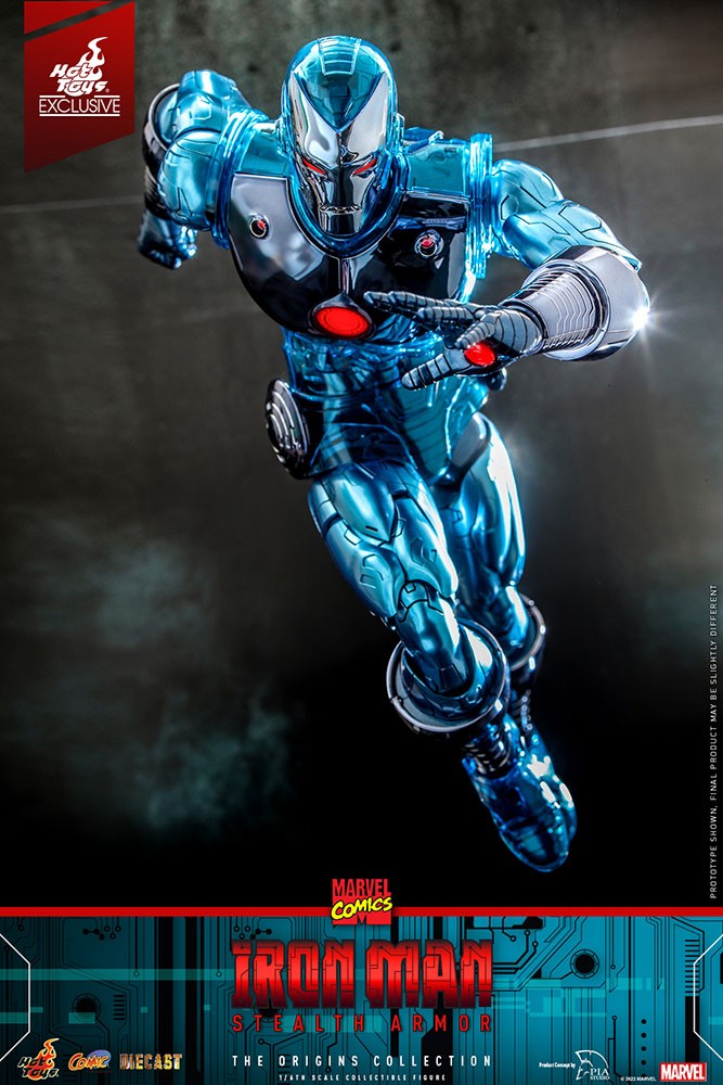 Sideshow y Hot Toys se complacen en presentar la figura Hot Toys Iron Man Stealth Armor a escala 1/6 fundida a presión (Die Cast) con armaduras brillantes en color azul cromado como la última incorporación a The Origins Collection. Es un artículo exclusivo de Hot Toys disponible solo en mercados seleccionados. Basado en las páginas clásicas de Marvel Comics, la figura de Iron Man fundida a presión presenta una cabeza de casco con función de iluminación LED y dos estilos de máscaras intercambiables; una estructura y armadura de Iron Man de diseño aerodinámico distintivo que ilustra su detalle mecánico; bellamente pintado en color azul con apariencia metálica; piezas de armadura de cristal azul; máscaras y piezas de armadura intercambiables cromadas en azul para diferentes estilos de exhibición; Funciones de iluminación LED repartidas por la parte superior del cuerpo, Arc Reactor en el pecho y las palmas; manos intercambiables; y una base de figura de Marvel.