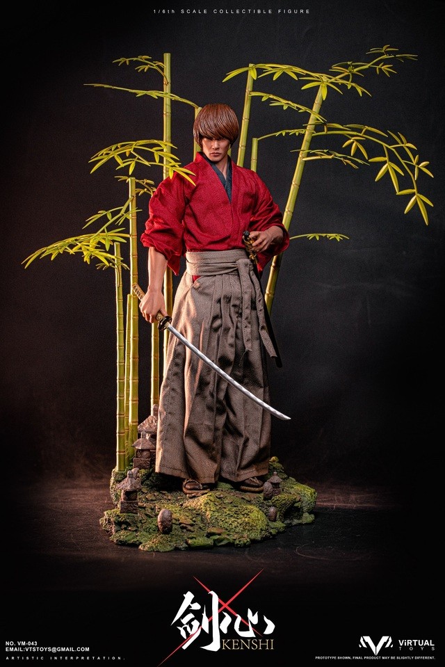 La figura Kenshi Escala 1/6 Normal Version VTS Toys incluye: Partes: -Escultura de cabeza realista exquisita (con dos tipos de accesorios para el cabello) -Cuerpo musculoso muy articulado -Mano especial con antebrazo (L+R, 8 en total) Disfraz: -Ropa interior oscura -Abrigo rojo brillante -Hakama gris claro -Calcetines Tabi Arma: -Aleación Sakabatō (hoja inversa) Accesorios: -Dango -Base de hojas de bambú
