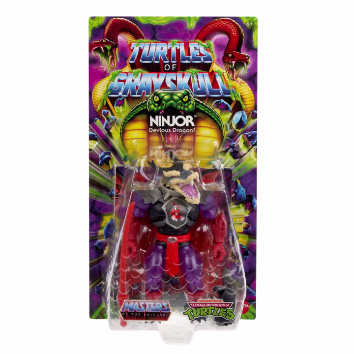 Desde la serie “Turtles of Grayskull” de Mattel, esta figura está altamente articulada y completamente posable, lo que permite recrear diversas escenas. Incluye accesorios y viene en un empaquetado tipo blister. Las ilustraciones del empaquetado son solo ejemplos y pueden diferir del diseño o variante de idioma del empaquetado real. Figura Ninjor Turtles of Grayskull.