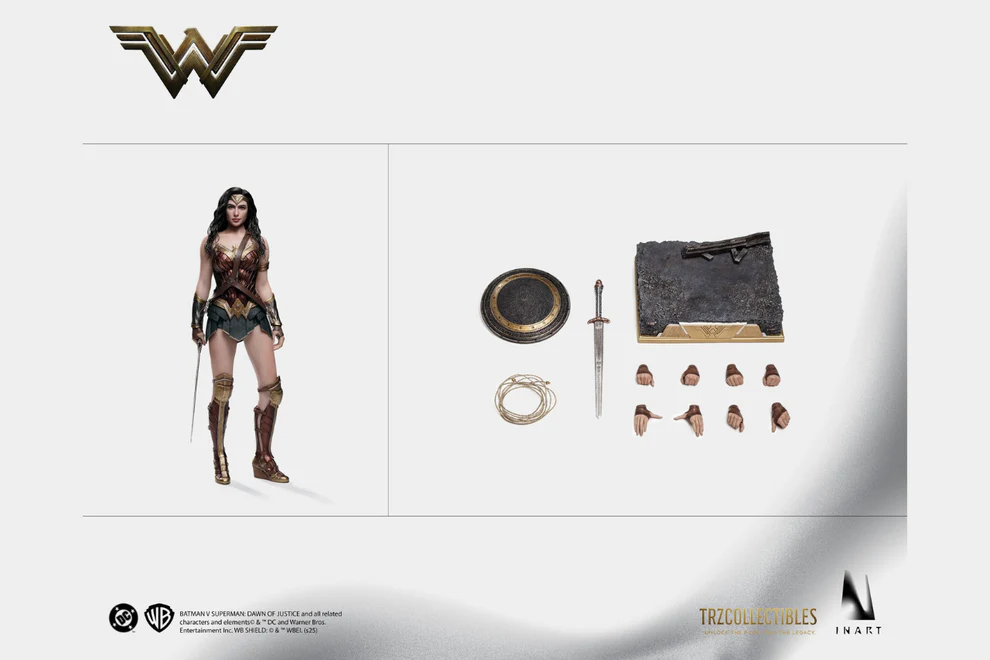 Además esta Figura Wonder Woman BvS Escala 1/6 INART, incluye cinco pares de manos intercambiables, accesorios esenciales como escudo y espada, y base metálica de soporte. Incluso incorpora un estuche de exhibición para la cabeza enraizada, ideal para coleccionistas exigentes.