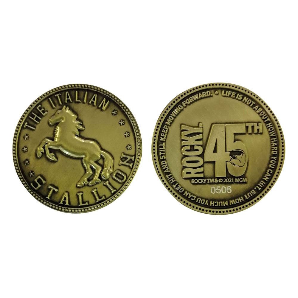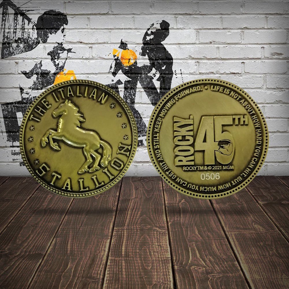 Moneda conmemorativa de Rocky, celebrando el 45 aniversario de la creación del más famoso personaje de Sylvester Stallone, fabricado en metal y con licencia oficial limitada a 9995 piezas.