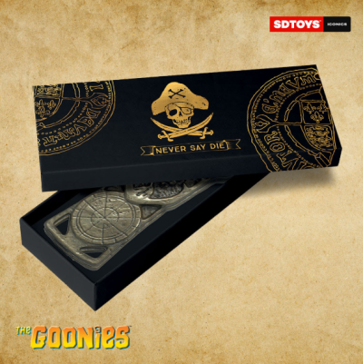 Con unas dimensiones de 17 x 7 x 0,5 cm y un peso de 450 gramos, esta fiel réplica, fabricada en aleación de zinc con un logrado acabado envejecido, ofrece una sensación realista al tacto que permite revivir la emoción de este clásico del cine de aventuras de los 80’s. En su reverso lleva grabada una pista del mapa: